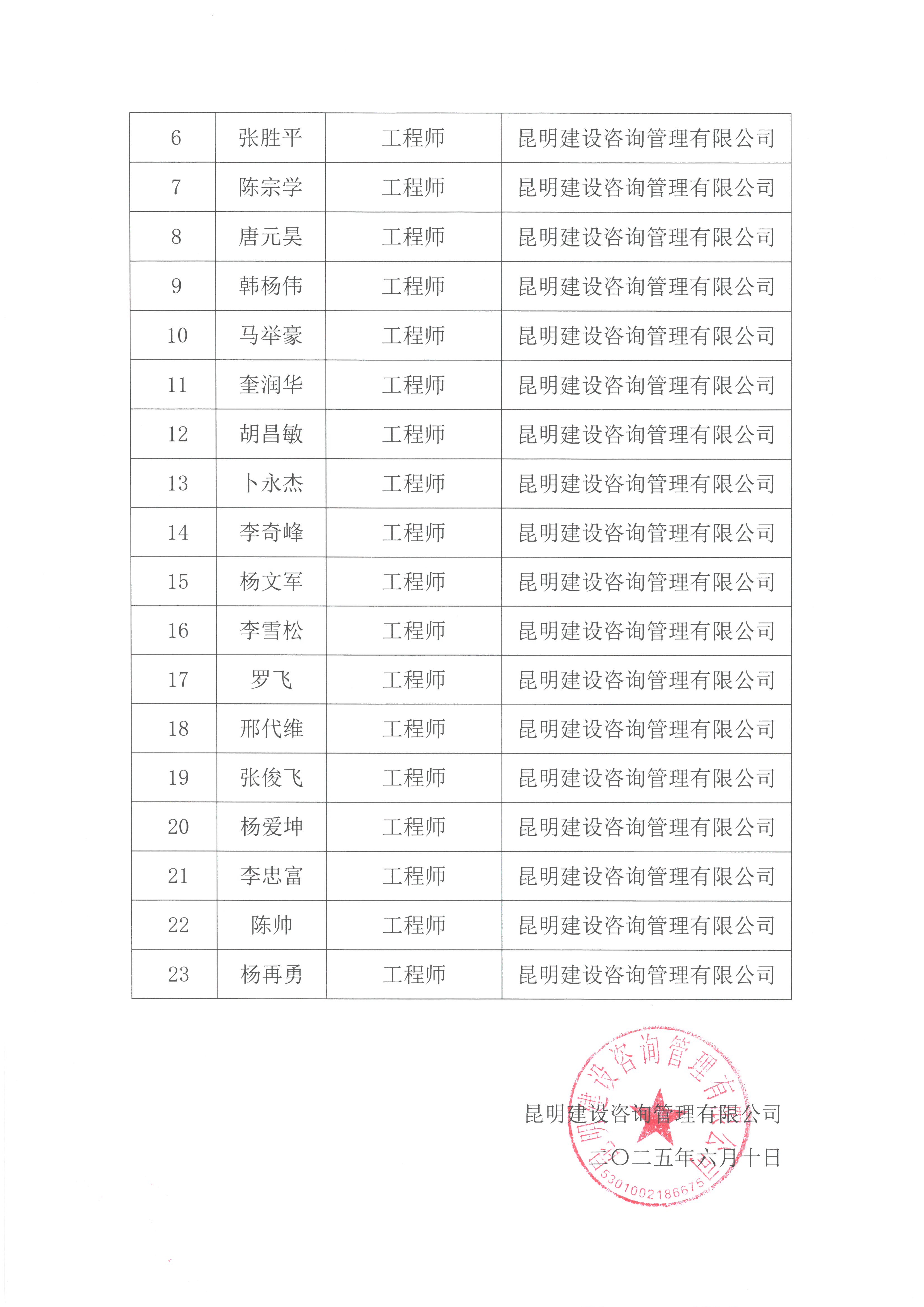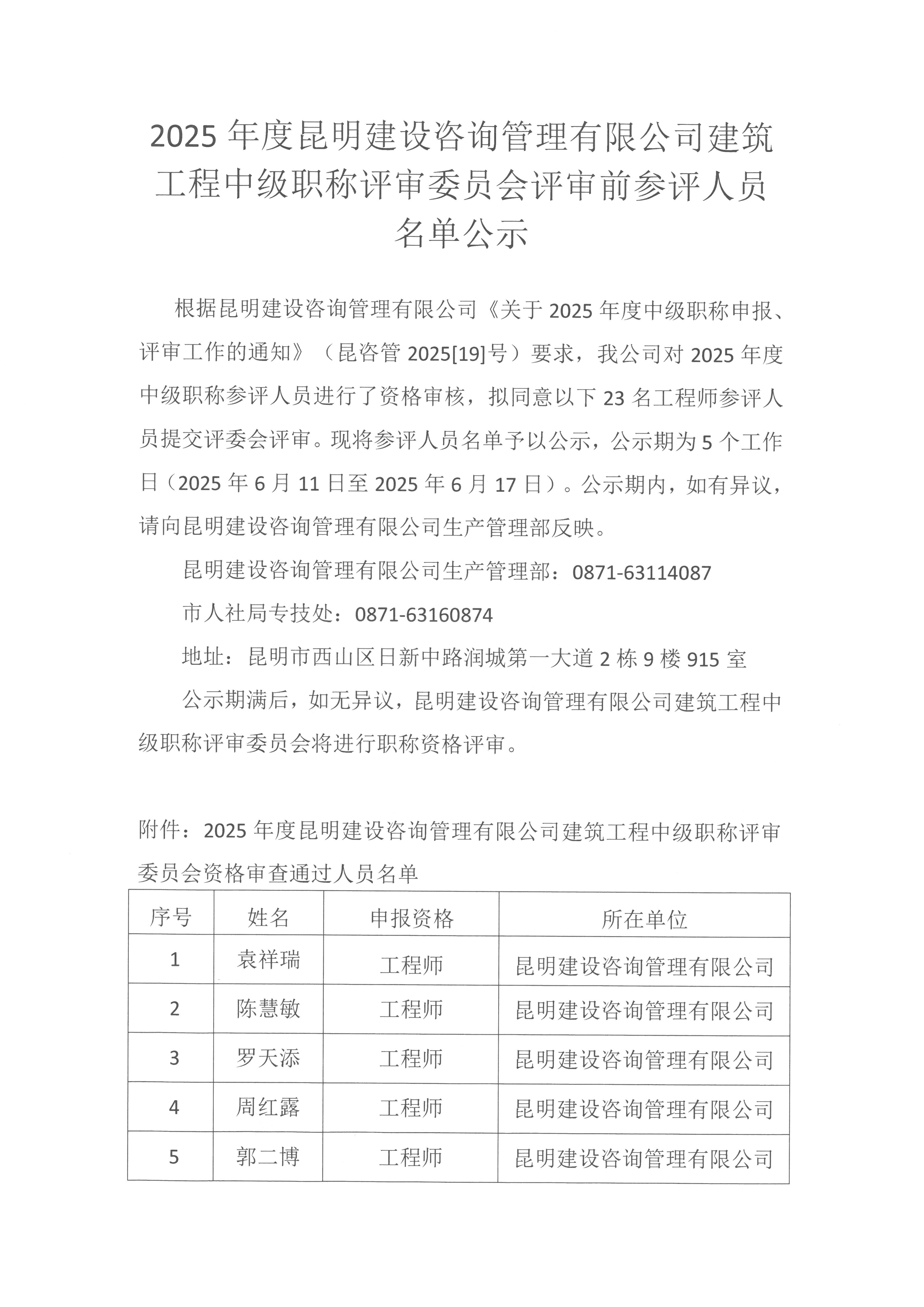 2025年度昆明建设咨询管理有限千亿(中国)建筑工程中级职称评审委员会评审前参评人员名单公示